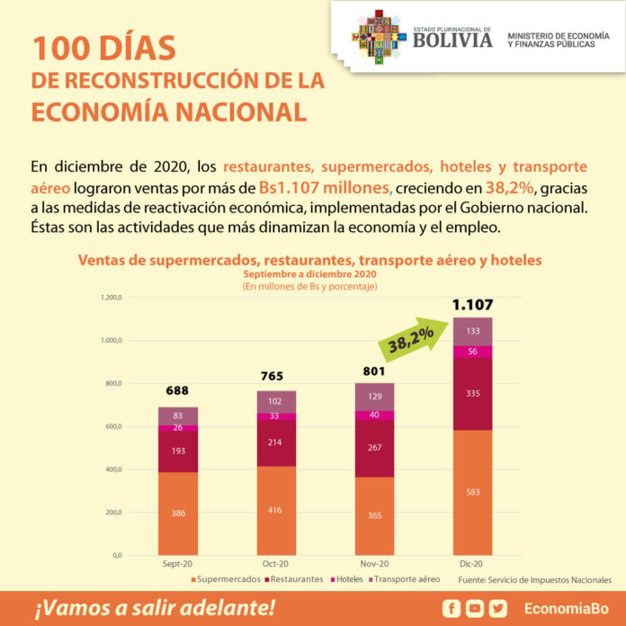 Signo de reactivación económica también es que, hasta diciembre de 2020, las actividades que más dinamizan la economía y el empleo, como supermercados, restaurantes, transporte aéreo y hoteles, aumentaron sus ventas en 38,2% respecto a noviembre de 2020, indica un informe del Ministerio de Economía difundido en Facebook.