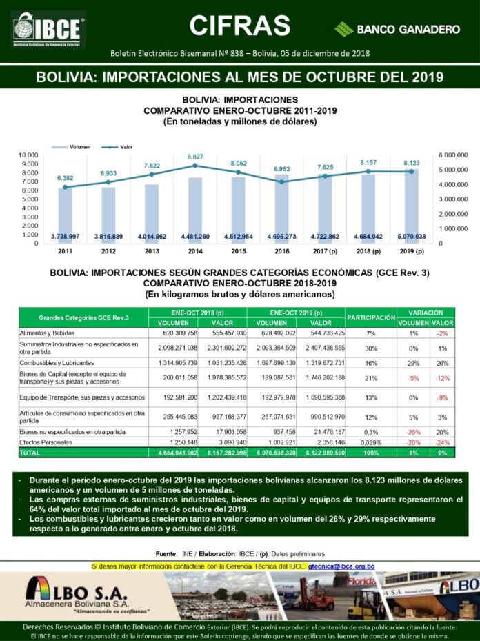Durante el período enero – octubre del 2019 las importaciones bolivianas alcanzaron los 8.123 millones de dólares americanos y un volumen de 5 millones de toneladas, de acuerdo al Instituto Boliviano de Comercio Exterior (IBCE).