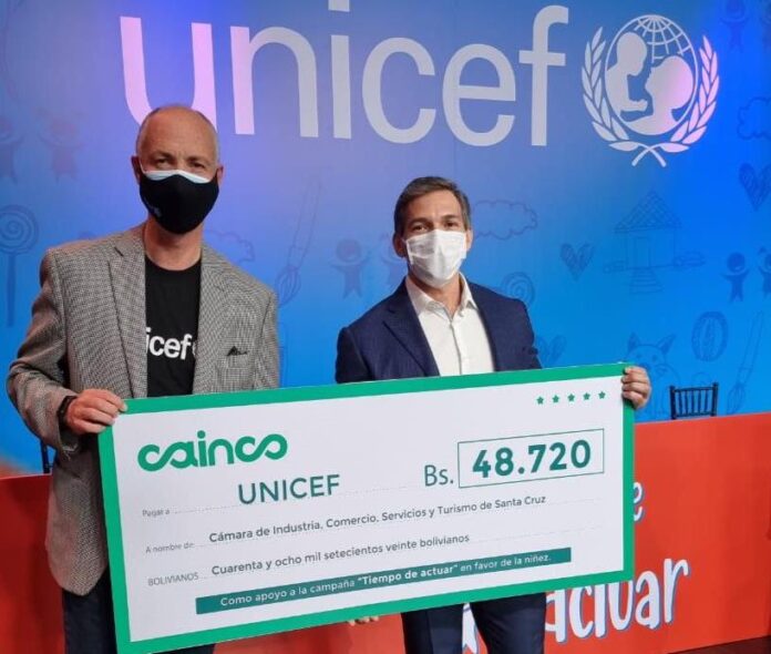 En el marco de las acciones solidarias realizadas por la Cámara de Industria, Comercio, Servicios y Turismo de Santa Cruz – CAINCO, este sábado 26 de junio se llevó a cabo la entrega de una donación económica a UNICEF, como apoyo a la campaña “Tiempo de actuar”, cuyo objetivo es garantizar la continuidad de servicios esenciales de salud, educación y protección para la niñez.