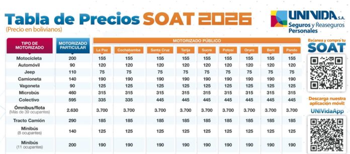La empresa de seguros y reaseguros Univida publicó la tabla de precios del Seguro Obligatorio de Accidentes de Tránsito (SOAT) 2026, los cuales se mantienen congelados por quinto año consecutivo.