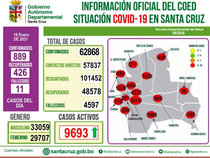 El director del Sedes, Marcelo Ríos informó que para hoy los laboratorios oficiales reportaron 889 nuevos casos de Covid-19 en Santa Cruz, lo que asciende la cifra de casos activos a 9693.