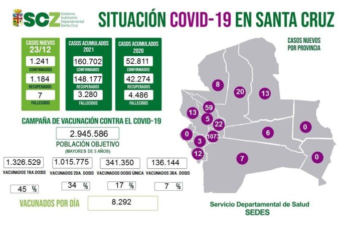 En Santa Cruz la vacunación masiva continúa en todos los puntos habilitados, este jueves 8.292 recibieron sus dosis, 45% con la primera dosis, 34% con su segunda dosis y 17% con la tercera dosis.