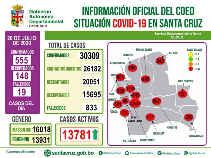Marcelo Ríos, director del Sedes, confirmó 555 nuevos casos de Covid-19 en Santa Cruz haciendo un total de 30.309 en todo el departamento, de los cuales 13.781 personas aún se encuentran luchando esta batalla contra el virus; al mismo tiempo lamentó que 19 pacientes hubiesen perdido la vida, haciendo que la cifra de fallecido siga en ascenso.