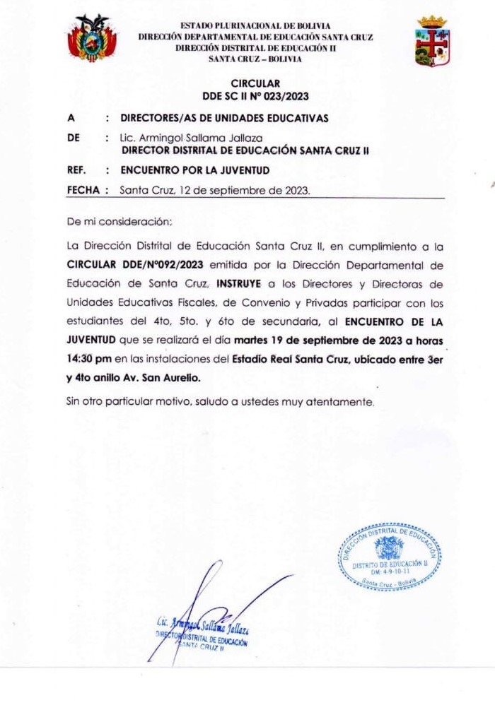 Denuncian que través de un instructivo, el director Distrital de Educación de Santa Cruz, Armingol Sallama, ordenó que los estudiantes de los tres últimos cursos de secundaria participen en el encuentro denominado “Juventud FEST”, en el estadio de Real Santa Cruz, organizado por las juventudes del Movimiento Al Socialismo (MAS) donde se respaldó al presidente Luis Arce.