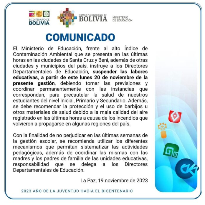 “Se instruye a los Directores Departamentales de Educación, suspender las labores educativas, a partir de este lunes 20 de noviembre de la presente gestión, debiendo tomar las previsiones y coordinar permanentemente con las instancias que correspondan, para precautelar la salud de nuestros estudiantes del nivel inicial, primario y secundario”, refiere el comunicado.