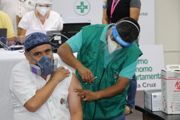 Después de haberse vacunado este lunes en los hospitales Japonés y Oscar Urenda, de Montero, hoy se continúa en simultáneo en tres nosocomios (San Juan de Dios, de Niños y Oncológico), siguiendo el avance de la meta programada de entre 200 a dosis diarias, siendo muy rigurosos en la parte de bioseguridad.