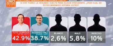 Ante la pregunta “Si hoy fuera la segunda vuelta para elegir presidente, ¿por cuál de estos binomios votaría usted?”, un 42,9% de los encuestados manifestó su respaldo a Jorge ‘Tuto’ Quiroga, mientras que un 38,7% expresó su preferencia por Rodrigo Paz.