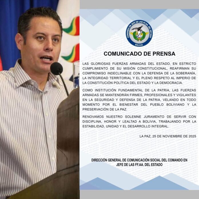 Las Fuerzas Armadas emitieron un pronunciamiento firme tras las declaraciones del vicepresidente Edman Lara, quien sugirió que con respaldo militar “llegaría lejos”. La institución castrense respondió con un mensaje directo: su compromiso es con el país, la Constitución Política del Estado y la democracia, no con ambiciones personales.