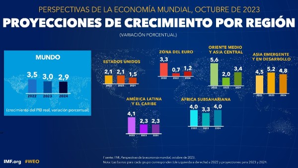 Con esas proyecciones, la economía mundial desacelerará su crecimiento al 2,9% el 2024; un 0,1% menos con relación al 3,0% de este año.