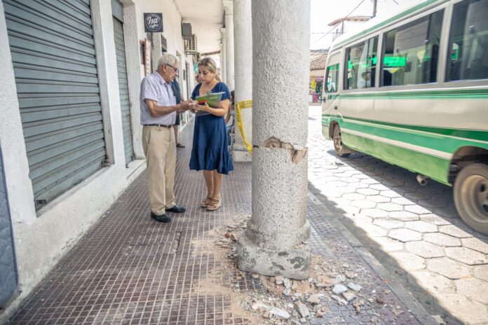 La alcaldía cruceña inspeccionó, en el centro de la ciudad, un edificio de preservación que sufrió un daño en la columna exterior de la galería, producto de un accidente ocasionado por un micro.