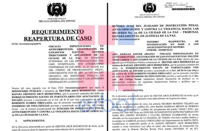 La Fiscalía Departamental de La Paz determinó reabrir la investigación penal contra Rafael Arce Mosqueira, hijo del presidente Luis Arce, por el presunto delito de enriquecimiento ilícito de particulares con afectación al Estado, según consta en el documento oficial proporcionado por el diputado Héctor Arce Rodríguez, denunciante del caso.