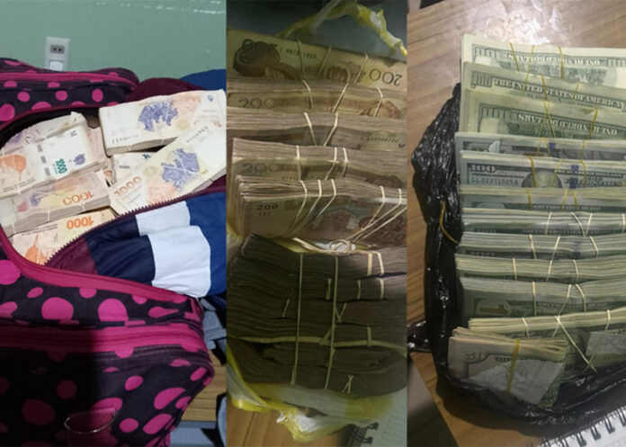 El hallazgo fue concretado en inmediaciones de la tranca “La Pintada” durante la inspección a un motorizado, que en cuyo interior había dos maletas que contenían billetes de diferentes cortes y de diferentes monedas.