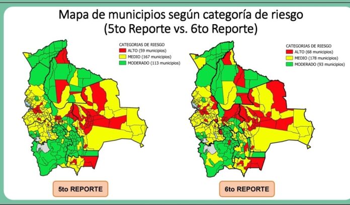 Según los datos del informe, Santa Cruz sigue siendo el departamento con más municipios en riesgo alto con 24, Cochabamba tiene 15, La Paz 14, Beni 5, Tarija 4, Potosí 3, Chuquisaca 1, Pando 1 y Oruro 1.