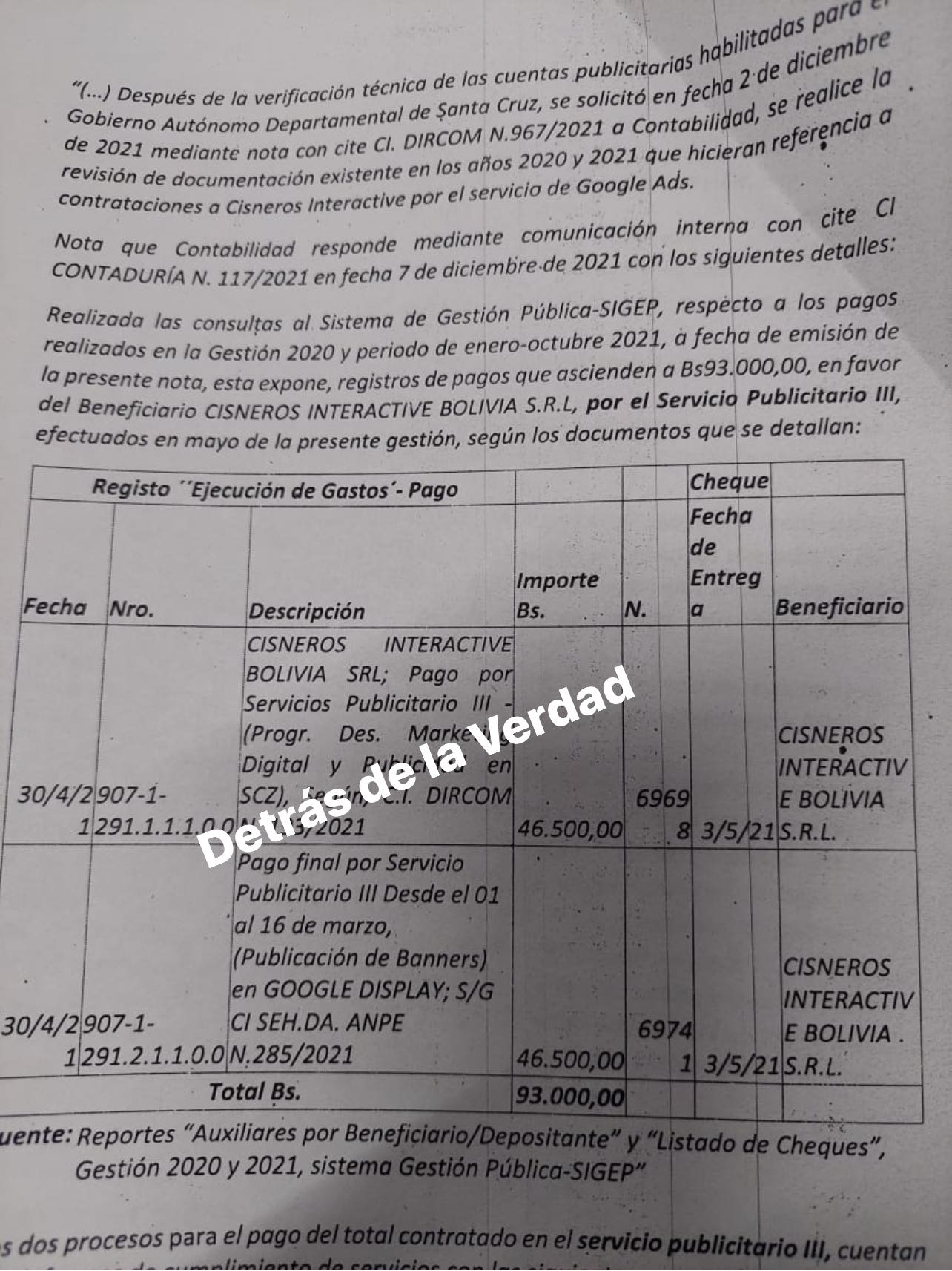 Se filtra documentación de pagos de la Gobernación de Santa Cruz durante la gestión de Ruben Costas a la empresa Cisneros Interactiva Bolivia que ahora es investigada por la fiscalía por el caso ‘publicidad fantasma’.