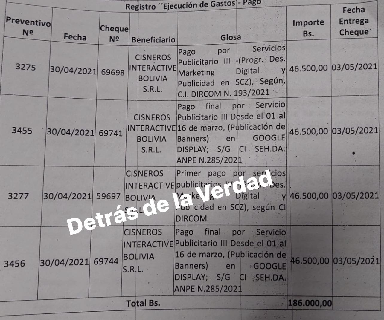 De acuerdo al detalle, al que tuvo acceso Detrás de la verdad, la gobernación realizó 6 pagos el último día de la gestión de Costas por un monto total de Bs. 186.000, estos son los siguientes pagos que se realizó a la empresa Cisneros Interactive Bolivia.