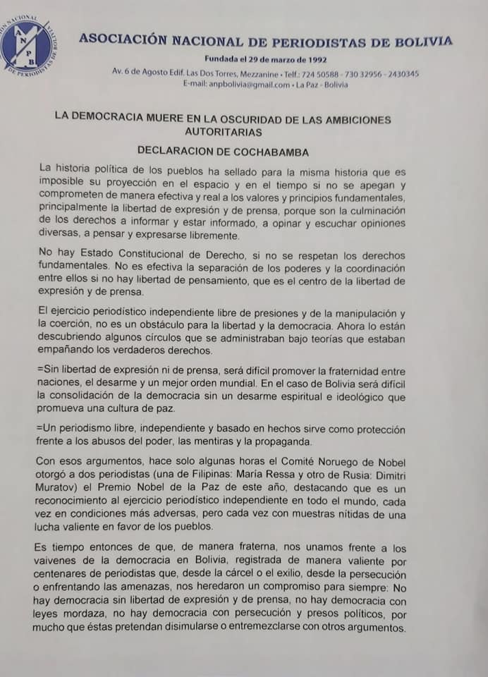 “Las reiteradas conductas de regímenes arbitrarios que se deleitan con teorías de un ejercicio periodístico bajo control político develan un desprecio a la democracia y a los derechos humanos; manosean la Constitución y las leyes y pisotean la dignidad del pueblo boliviano. Sus mentores y serviles no parecen haber aprendido la dramática historia de las dictaduras que se pasearon por las esferas del poder, apasionados hasta apegarse a conductas delincuenciales”, señala en uno de sus puntos la Declaración de Cochabamba.