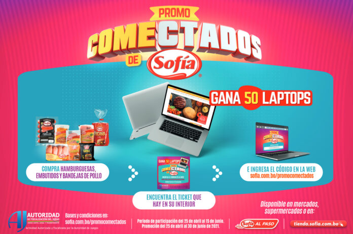 Con el objetivo de conectar a muchos bolivianos y bolivianas, Sofía lanza su segunda promoción del año para impulsar el teletrabajo y tele estudio y da la posibilidad de llevarse 50 laptops, insertando los tickets de la promoción que vienen en los productos que participan de las línea de embutidos al vacío de Sofía, bandejas de pollo Sofía y hamburguesas Sofía .