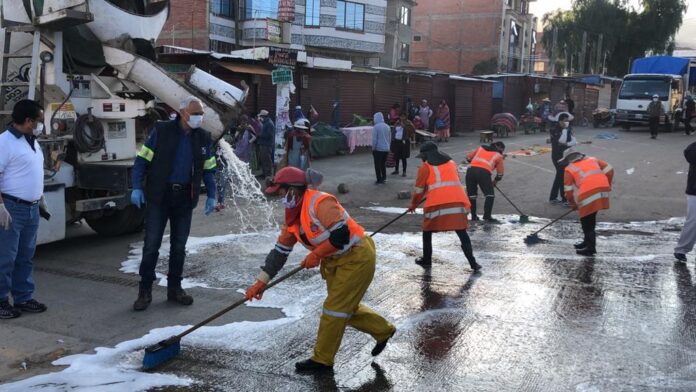 El mercado 10 de febrero de la ciudad de Cochabamaba fue el primer espacio público elegido para poner en marcha la campaña de desinfección “Unidos limpiando nuestras calles”, que impulsan Unilever y Soboce, con el apoyo de varias alcaldías del país, para prevenir la propagación del COVID-19.